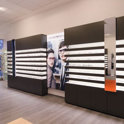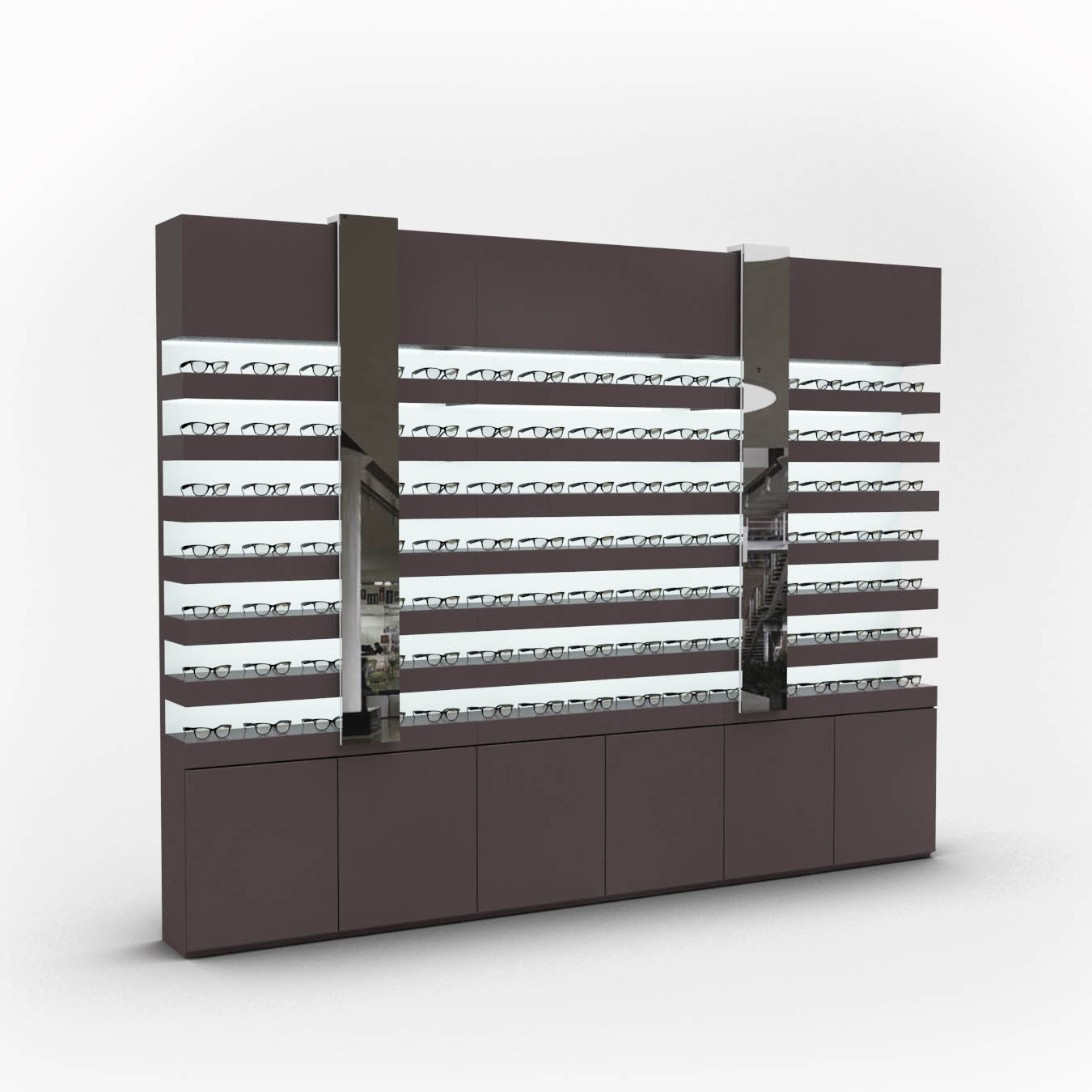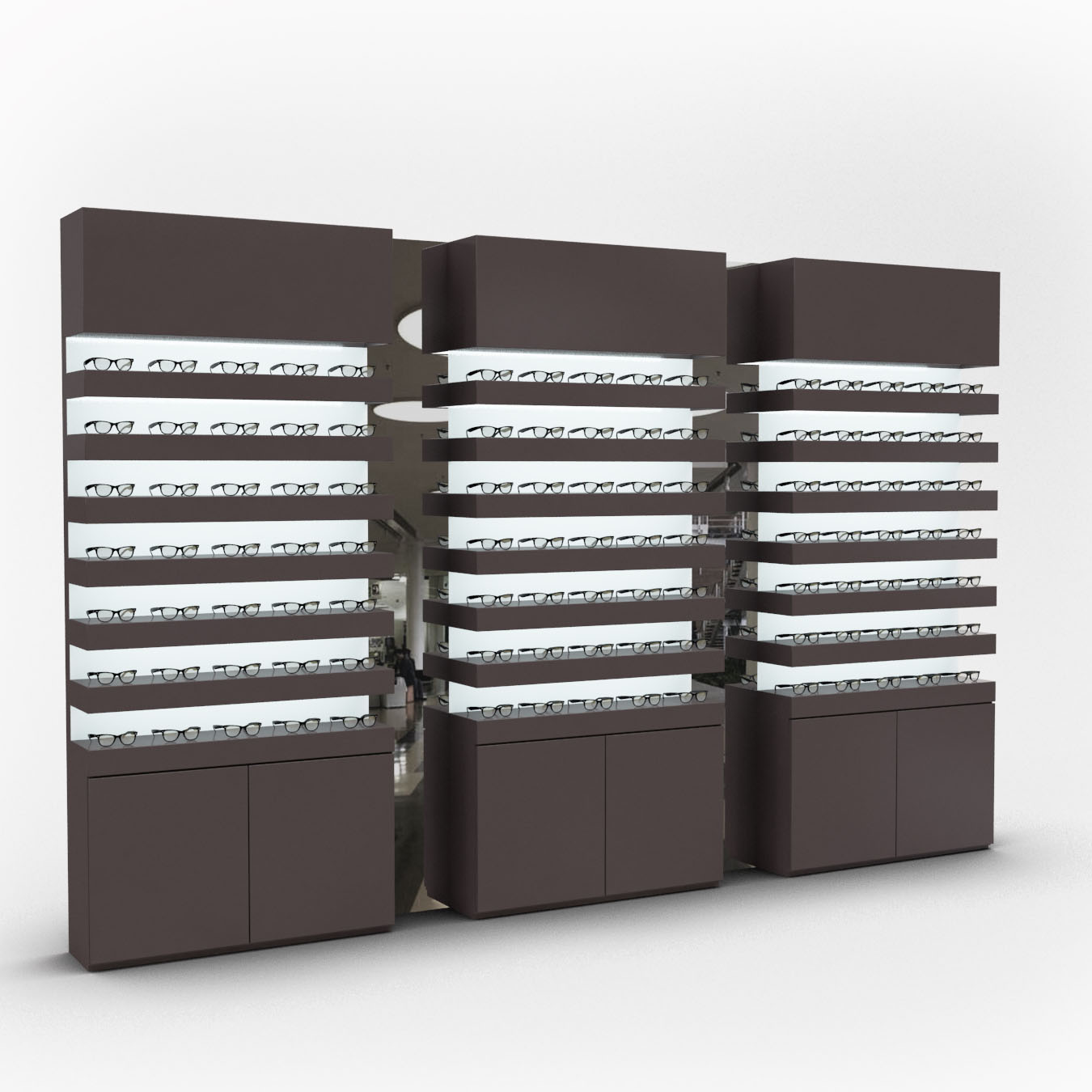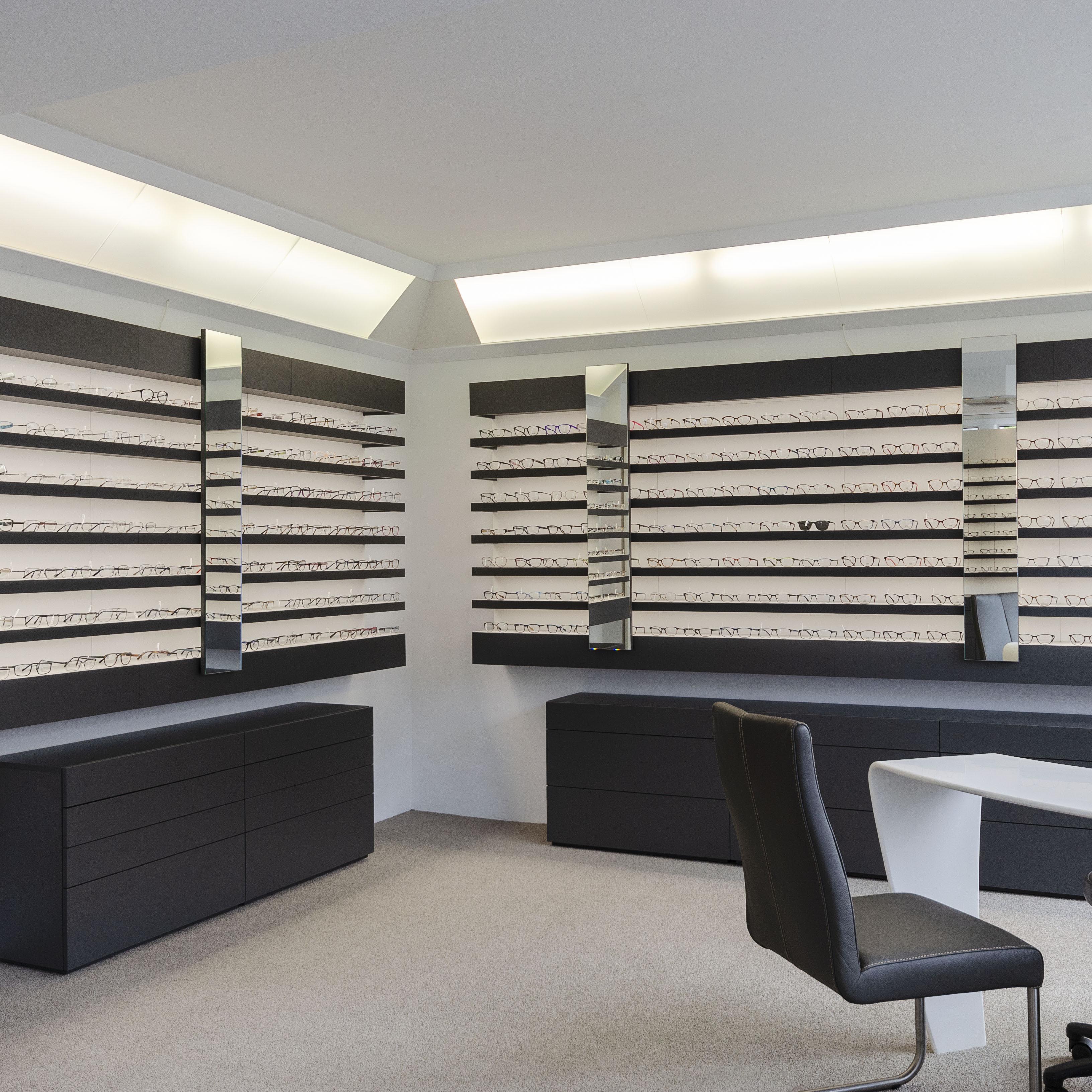 Die CASCADA Linie C2 ist in vielen verschiedenen Ausführungen erhältlich und zeichnet sich durch ihre Kompaktheit und perfekte Warenausleuchtung aus. Die Module bestehen aus Warenpräsentationen, die die Möglichkeit bieten, Stauräume und Beschriftungs- bzw. Werbeflächen zu integrieren. Die Präsentation erfolgt auf einzeln beleuchteten Ablageflächen. Sie haben je nach gewünschter Brillenmenge, die Wahl zwischen 7, 8 oder 9 Nischen. Um Ihren Raum gut zu nutzen, bieten wir die Module in den Breiten 84 cm und 100 cm an. Farben und Oberflächen sind frei wählbar und können somit optimal an Ihr Konzept angepasst werden.